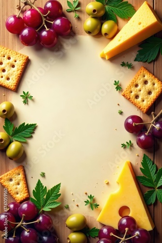 Whimsical doodles of cheese, crackers, grapes, & olives on a wooden board background, doodle, home