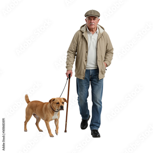 "Realistic 3D Rendering of Elderly Man Walking with Small Dog"