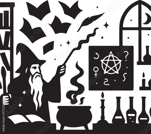 This image is a black and white vector arart with a Halloween theme.