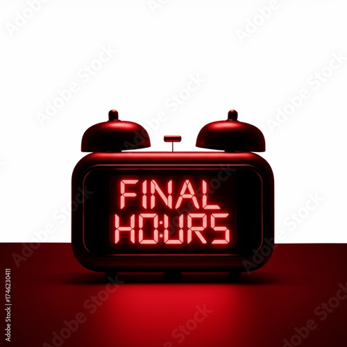"FINAL HOURS" alarm clock, urgent, representing a limited-time offer or deadline, against a striking red and white background, with copy space