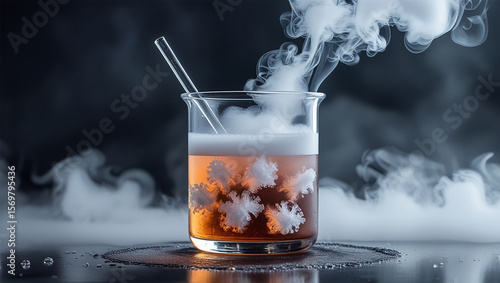 "A molecular-style cocktail served in a laboratory beaker, with swirling dry ice fog cascading dramatically over the rim."
