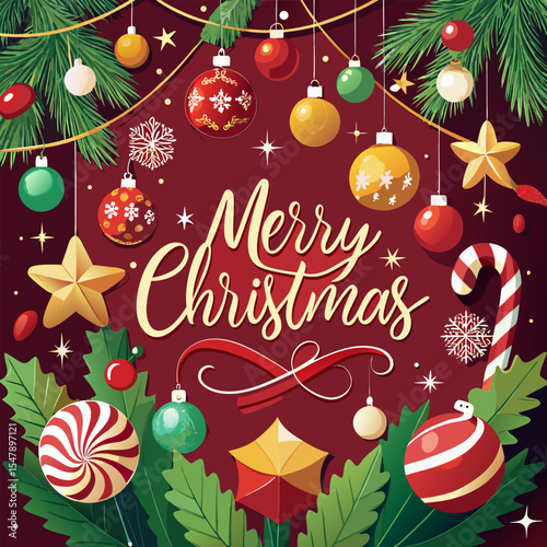 "Festive Christmas Celebration Card with Holiday Decorations and Merry Greetings – Vector Illustration"