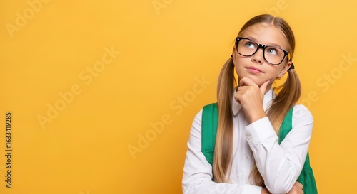 A young girl with glasses and pigtails is thinking, with her hand on her chin, against a yellow background.