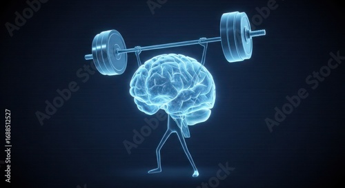 A stylized, digital illustration of a brain lifting weights, symbolizing mental strength and effort.