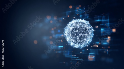Glowing wire-frame spherical object with interconnected lines and points emits bright white-blue light in a dark blue background, surrounded by faint digital elements and orange-yellow light points.