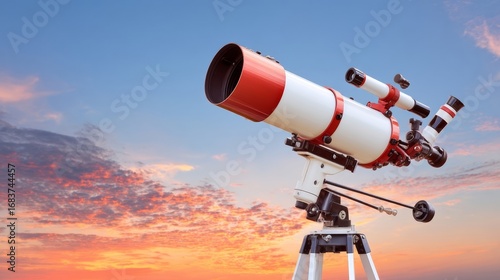 A red and white telescope points towards the sky during sunset, featuring dual eyepieces near its large lens,
