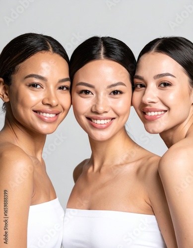 Three smiling diverse women representing different ages and ethnicities, with a focus on beauty
