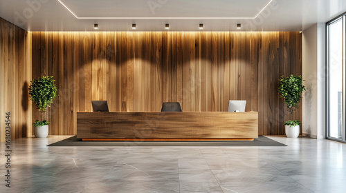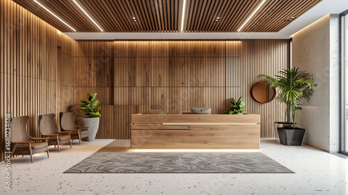 "A luxurious, modern hotel lobby in Islamabad, Pakistan, showcasing exquisite wooden slat design, a golden reception desk, and sophisticated lighting, embodying elegance and warmth for a grand welcome