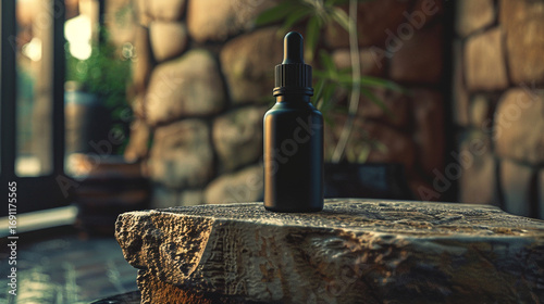 "Organic Skincare Elixir: A Sleek Black Dropper Bottle Elegantly Displayed on Natural, Textured Rocks and a Reflective Water Surface, Creating a Minimalist and Earthy Aesthetic for Premium Cosmetic Pr