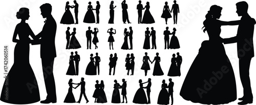 "Wedding couple silhouettes, bride and groom dancing, romantic love, wedding ceremony, celebration, marriage, elegant dress, formal attire, romantic moments, togetherness."