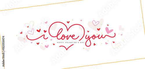 "I Love You" script typography with a heart detail, framed by small doodle hearts and a subtle gold border.