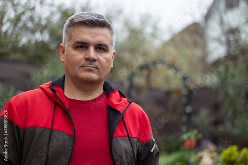 Portrait of a man 40-50 years old, gray-haired, swarthy. Serious look. Big eyebrows. Red jacket. Looking at the camera