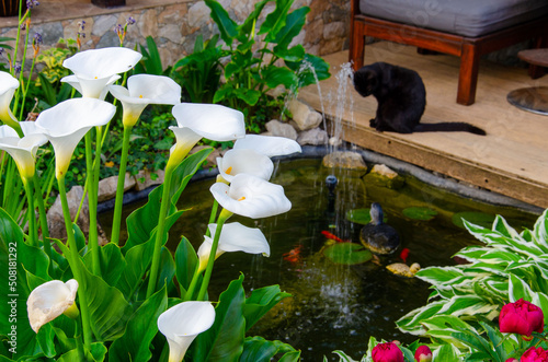 Small backyard pond decoration. Artificial pond in garden. Pool aquatic plants. Pond border decoration. Summer. Pet. Black cat