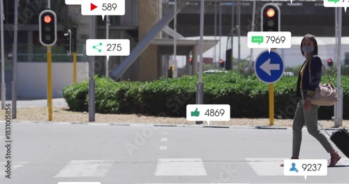 Masked woman crossing crosswalk commuting, notifications appearing and clustering around suitcase