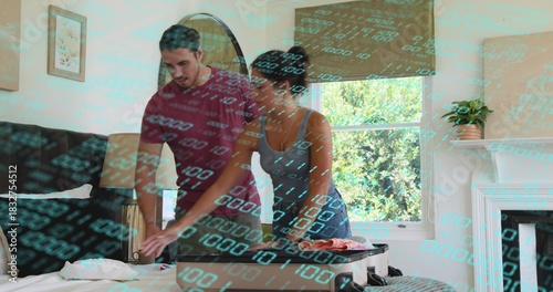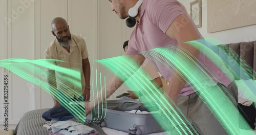 Mature man folding and packing suitcase for travel, floating numerical AR graphics tracking items