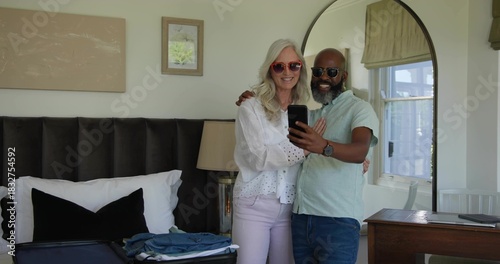 Taking selfie senior couple wearing shades, smiling and posing in bedroom with phone, open suitcase