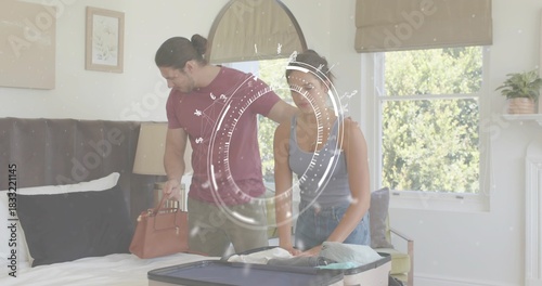 Packing couple arranging clothes on bed in bedroom with open suitcase and scattered travel items