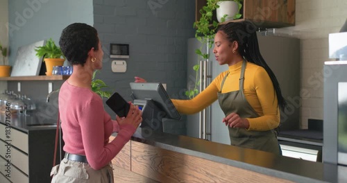 Barista and customer engaging payment after pointing menu and scanning phone at cafe, copy space