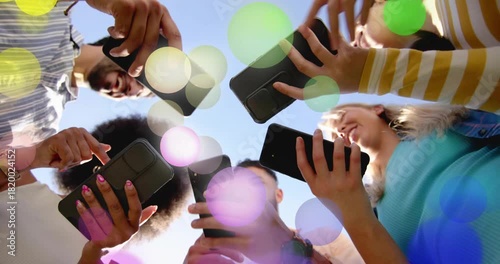 Five adults circling low cam tapping phones sharing social content causing colored circles drifting