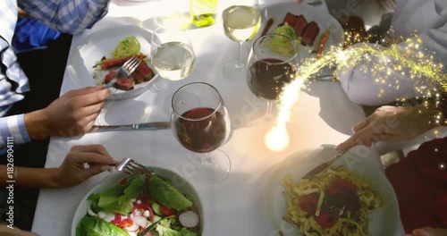 Four diners sharing food at white table golden trail appearing from right threading between glasses