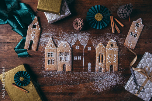 Gingerbread house. Set of vector hand drawn gingerbread houses. Christmas cookies. Brown and white colors.
