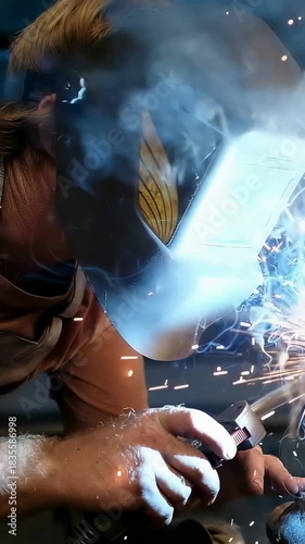 Vertical video: Adjusting helmet and gripping torch at bench welder guiding welding arc along seam