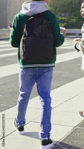 Vertical video: Walking teen in beanie crossing plaza to crosswalk, carrying bag and pens, talking