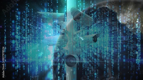 CCTV pole holding cams, cyan pillar rising, starting code rain and rotating globe, overlaying data