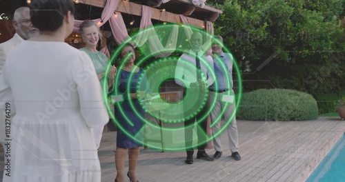 Bride tossing bouquet toward guests reaching, green HUD partially obscuring view for wedding ritual