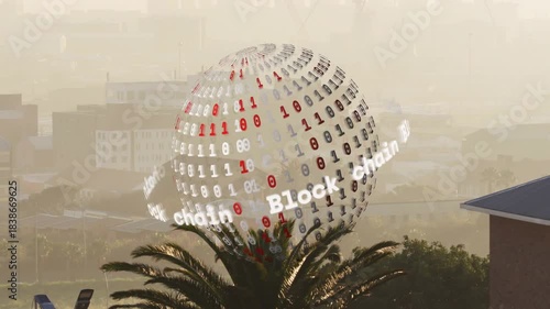 Transparent 3D sphere appearing left rotating clockwise above palm tree visualizing blockchain flow