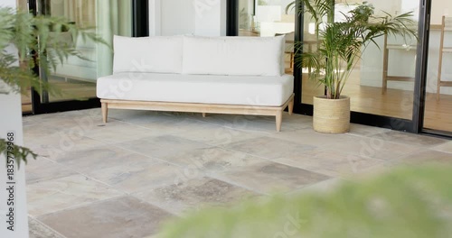 Camera is starting recording tiled patio with wooden sofa and potted palm as outdoor showcase