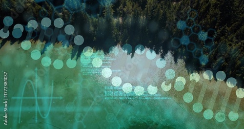 Floating DNA helix overlaying pine forest and turquoise lake, with hex patterns and code waves