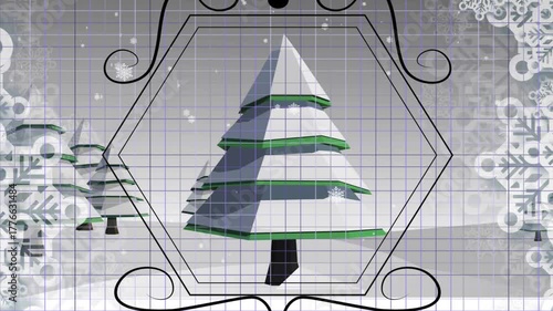 1s timer starting flakes drifting around pine tree, lace motifs sliding from right enhancing scene