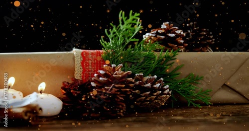Hand adding candle beside gift and pine cones, sparkles drifting, lighting and removing making glow