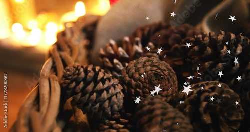 Camera focusing burlap-wrapped pine cones in basket, star lights drifting highlighting candle glow