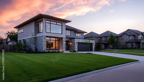"A modern suburban home wallpaper featuring a two-story house with a sleek design, large windows, and a manicured lawn, set against the backdrop of a peaceful neighborhood in Plano, Texas."