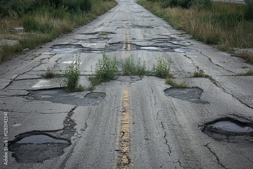 Dilapidated asphalt road with potholes, cracks, and weeds, stretching into the distance under a cloudy sky, emphasizing disrepair and abandonment in the countryside.