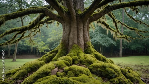 Majestic moss-covered tree in a serene forest setting with ample space for text and creative designs