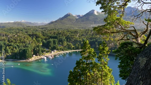 View to Villa La Angostura, Argentina, Patagonia, Lake district. Blue bay, green trees and mountains. UHD, 4K