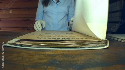 Captivating archivist carefully handling an old document in a dimly-lit room.