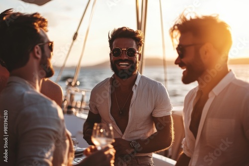 Guys night out - diverse men friends at yacht having fun on vacation at sunset. bachelor party trip.