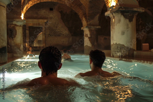 Happy people visiting bathhouse taking pleasure from hot water procedures spa center, Generative AI
