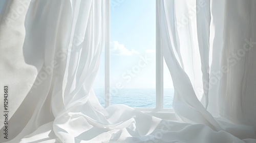 3D White window curtains. Realistic set of billowing silk cloth in blowing wind. Luxury flowing tissue, clear textile with drapery and folds, hanging satin fabric isolated on grey background 3D render