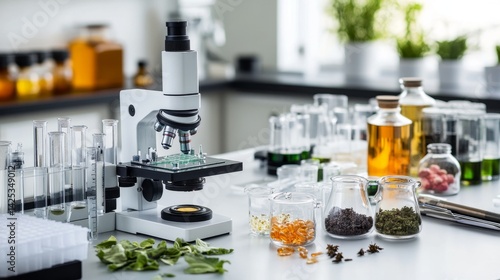A biotechnology engineer developing plant based proteins for sustainable food production, lab with plant samples, protein extraction equipment