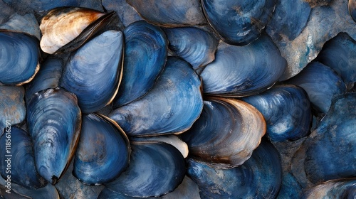Blue mussel shells arranged artistically creating a textured background showcasing natural ocean colors and patterns for culinary or marine themes