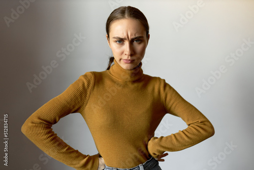 Portrait of frustrated displeased angry woman standing with hands on waist, looking at camera with mad facial expression, frowning with anger, isolated on white. Body language. Negative emotions