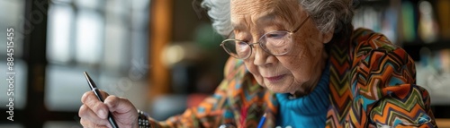 Elderly woman in glasses holds a pen, looking focused and engaged.