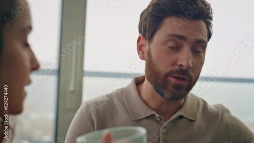 Man hands pouring coffee cup for loving wife at morning kitchen room closeup.