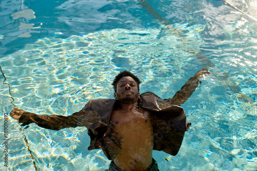 A man calmly floating on his back in a clear swimming pool while wearing a dress shirt.