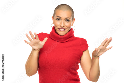 Studio shot of bald woman in red turtleneck top gesturing calmly as if talking or calming on white background.